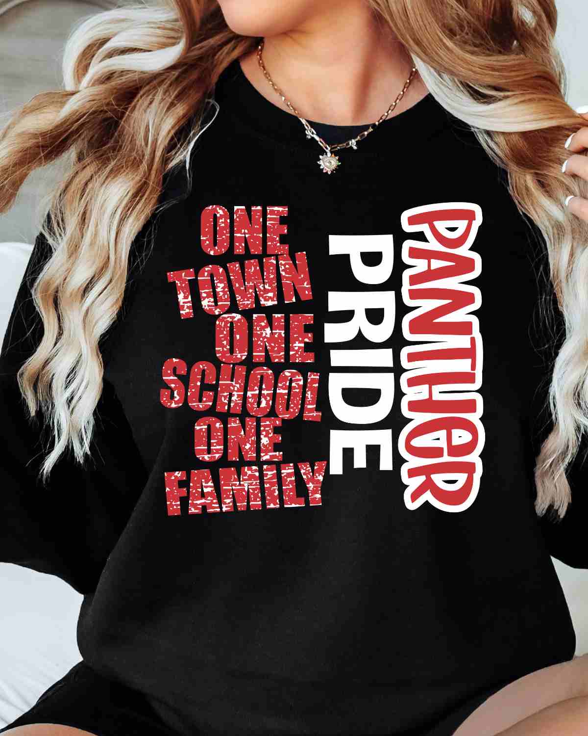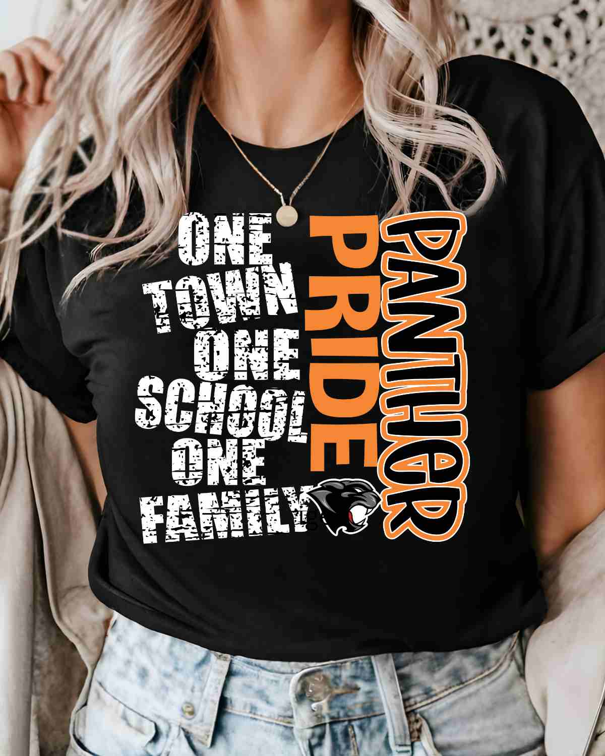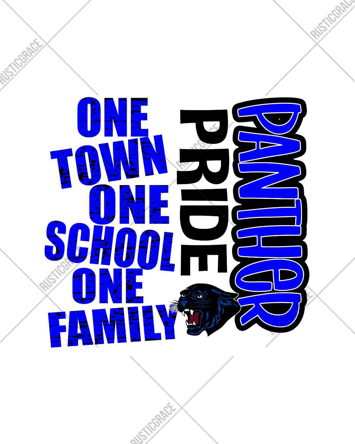 The One Town One School Panther Pride Transfer features a bold, full-color design of a panther with the text "One Town One School" in a classic font. This transfer is perfect for showing your school pride at sporting events, pep rallies, or just around town. At Rustic Grace, we offer a wide selection of heat transfer designs, including custom options, to meet all of your needs.