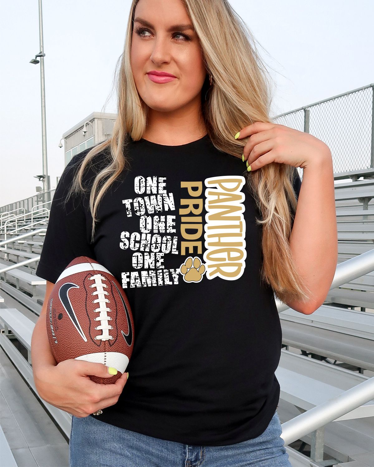Are you looking to show your school spirit with a unique and vibrant design on your t-shirt? Look no further than the One Town One School Panther Pride Heat Transfer from Rustic Grace Heat Transfer Company. Our high-quality direct to film transfer can be used on any color fabric, including cotton, poly/cotton blend, and 100% polyester. Unlike sublimation, our design is pressed onto the garment with high pressure for 15 seconds at 305 degrees and peels hot.